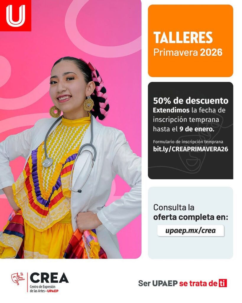 CREA UPAEP informó que ya se encuentran abiertas las inscripciones para sus talleres artísticos correspondientes al periodo primavera 2026, los cuales se llevarán a cabo del 26 de enero al 9 de mayo. La oferta contempla cursos matutinos y vespertinos en disciplinas como bailes latinos, ballet, danzas árabes, zumba y GAP, entre otros.