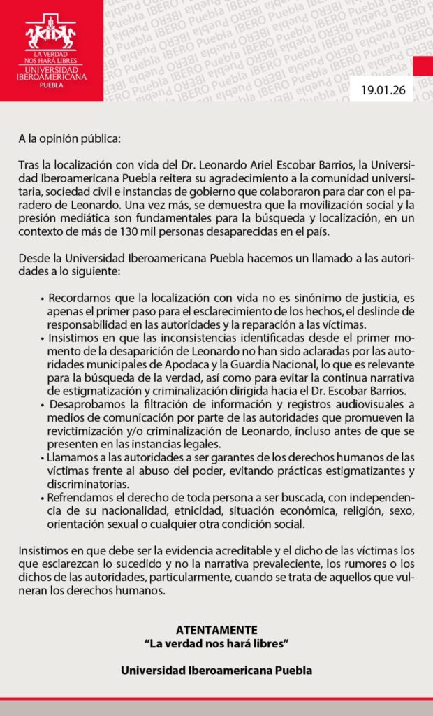Tras la localización con vida del Dr. Leonardo Ariel Escobar Barrios, la Universidad Iberoamericana Puebla reiteró su agradecimiento a la comunidad universitaria, a la sociedad civil y a las instancias de gobierno que colaboraron para dar con su paradero, destacando la importancia de la movilización social y la presión mediática en los procesos de búsqueda, en un contexto donde en México se reportan más de 130 mil personas desaparecidas.