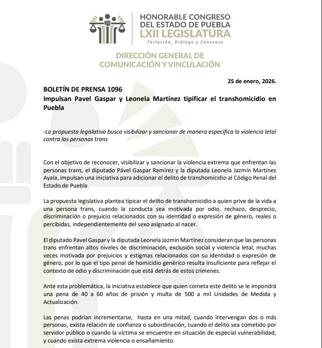 Con el objetivo de visibilizar y sancionar la violencia extrema contra las personas trans, los diputados Pavel Gaspar Ramírez y Leonela Jazmín Martínez Ayala presentaron una iniciativa para adicionar el delito de transhomicidio al Código Penal del Estado de Puebla.